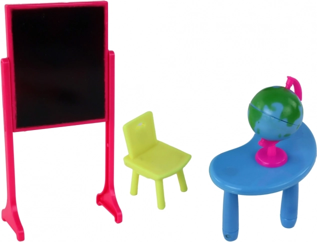 Set obsahuje plastovú tabuľu a glóbus, ktoré podporujú vzdelávanie a objavovanie sveta. Vďaka tomu prispievajú k rozvoju detskej fantázie a kreativity. Deti môžu využiť tento set k inscenácii rôznych školských scén a situácií, čím sa zabavia a učia zároveň.