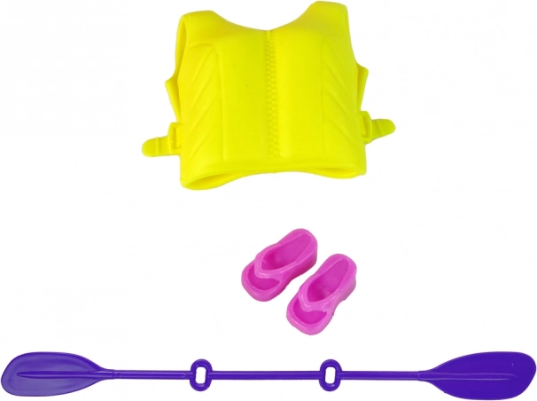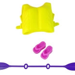 Sada obsahuje žltú záchrannú vestu a fialové pádlo, ktoré deťom umožňujú zažiť realistický vodný zážitok.