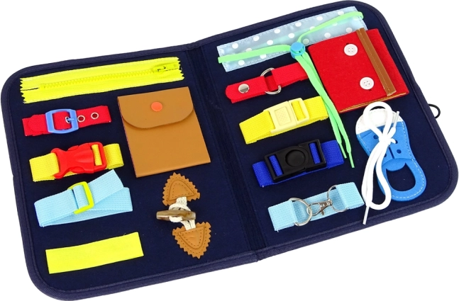 Doska ponúka rôzne druhy zapínania a aktivity, ktoré rozvíjajú jemné motorické schopnosti a podporujú samostatnosť detí.