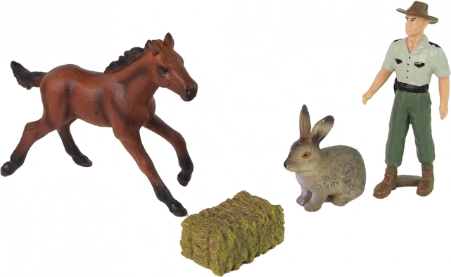 V balení nájdete hnedého koňa, farmára, zajaca a balík sena – ideálna kombinácia na realistické farmárske scénky. Vďaka kompaktným rozmerom sa figúrky dobre držia aj najmenším deťom.