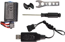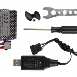 V balení nájdete: čln, ovládač 2,4 GHz, antikolisný kryt, akumulátor, USB nabíjací kábel, náhradnú skrutku, kľúč, skrutkovač, stojanček a návod.