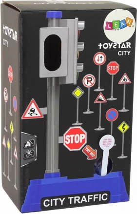 V sade nájdete sivé dopravné značky s rozmermi 13 cm x 9 cm x 23 cm. Tieto semafory sú nielen vizuálne realistické, ale aj fungujú – sú napájané dvoma batériami 2x1,5 V R6 AA, ktoré sú súčasťou sady. Tieto semafory vydávajú zvuk, ktorý je podobný zvuku skutočných svetiel na križovatkách. Navyše po zapnutí striedavo svieti červená pre vozidlá a zelená pre chodcov a naopak, presne ako v skutočnosti. Sú ozdobené dvoma značkami: značkou STOP a príkazom jazdy rovno alebo doprava. Na podstavci, na ktorom sú svetlá umiestnené, je navyše namaľovaný priechod pre chodcov, čo vnáša prvok praktického učenia.
