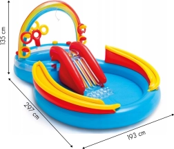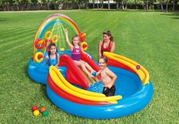 Nafukovacie vodné ihrisko Intex kombinuje plytký bazénik, šmykľavku a interaktívne prvky do jedného farebného centra zábavy. Dúhový oblúk s postrekom vytvorí osviežujúcu vodnú clonu, po ktorej deti bezpečne zídu po šmykľavke na mäkkú pristávaciu podložku. Dve vodné zóny s rozdielnou hĺbkou sú ideálne pre rôzne vekové kategórie.