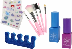 Pre jednoduchú aplikáciu je priložený praktický set nástrojov: 3 ružové štetce, aplikátor a kefka na obočie. Obsahuje tiež nevyhnutné položky pre zdobenie nechtov: modrý trblietavý oddeľovač prstov, pilník a 3D nálepky pre unikátny dizajn.