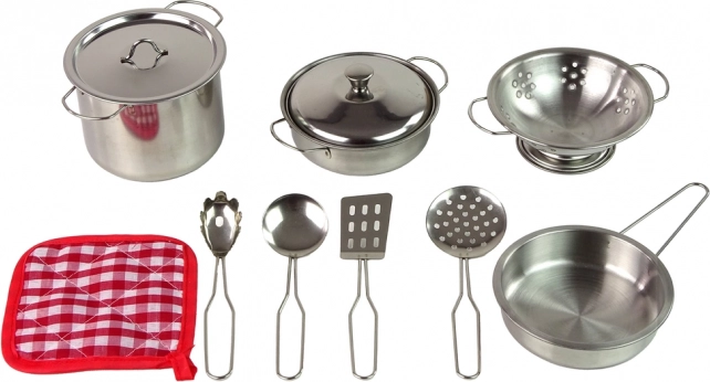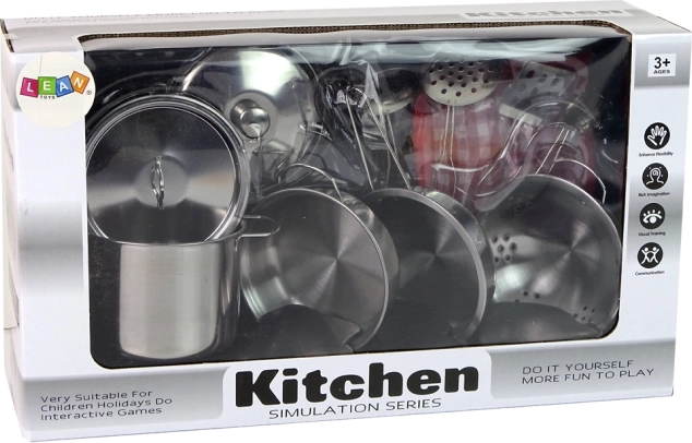 Súprava kovových hrncov a kuchynských doplnkov je určená pre malých nadšencov varenia. Snehobiele a strieborné doplnky poskytujú realistický vzhľad a podporujú rozvoj detskej predstavivosti aj ich kulinárskych zručností.