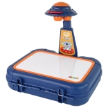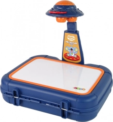 Tento interaktívny projektor na kreslenie v praktickom modrom kufríku umožňuje deťom premietať obrázky z tematických kotúčikov (zvieratá, oblečenie, lopty, ovocie, zelenina, dopravné prostriedky) na bielu plochu a ľahko ich obkresliť. Nastaviteľný stojan pomáha prispôsobiť výšku projekcie, aby bola kresba vždy pohodlná a jasná.