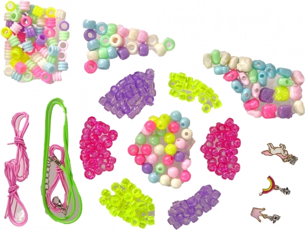 • Tri ružové nite, zelený remienok a tri prívesky: umožňujú vytvárať osobné náramky a náhrdelníky.
