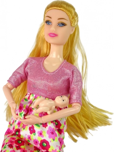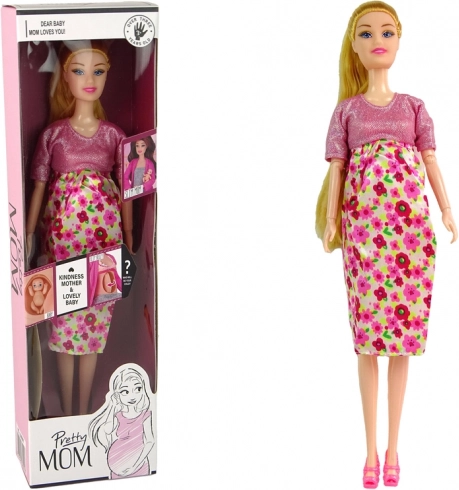 Táto krásna tehotná bábika s dlhými blond vlasmi a rozkošnými ružovými šatami s kvetinovým motívom prináša do hry kúzlo a štýl. Bruško je ľahko otočiteľné na ploché. Je ideálna pre malé slečny, ktoré milujú bábiky a tvorenie kúzelných príbehov.