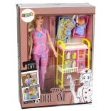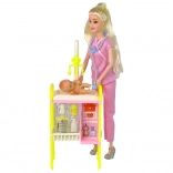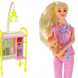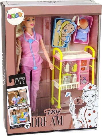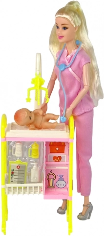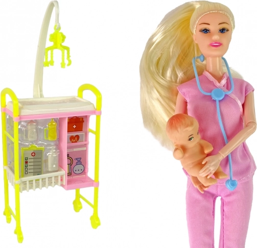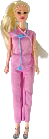 - Bábika je oblečená do ružového pracovného oblečenia s modrým stetoskopom okolo krku, pripravená ošetrovať malých pacientov.