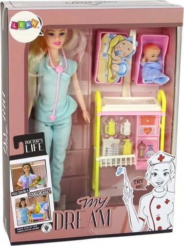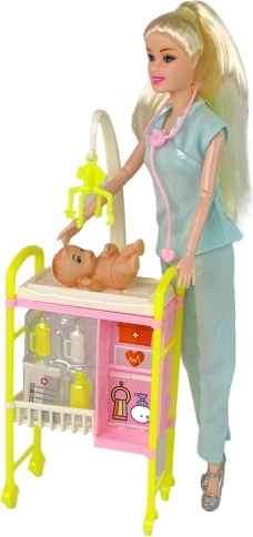 Pripravte sa na fascinujúci svet medicíny s touto výnimočnou bábikou. Oblečená v typickom lekárskom odeve s dlhými blond vlasmi, prináša autentickú atmosféru do každej hry. Ružový stetoskop dodáva na vierohodnosti, zatiaľ čo priložené doplnky ako dieťatko či zdravotnícky vozík podporujú kreatívnu hru.