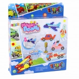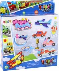 Balenie ponúka 8 farieb (žltá, oranžová, ružová, červená, čierna, biela, tmavomodrá, modrá), dve priehľadné podložky s hrotmi (štvorec a šesťuholník), pinzetu, aplikátor, rozprašovač, 4 závesné krúžky a zošit s predlohami – perfektná voľba pre začiatočníkov aj malých tvorcov milujúcich motívy dopravy.