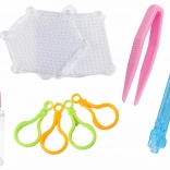 Súčasťou je všetko, čo malých tvorcov poteší: sprej na rovnomerné zvlhčenie, pinzeta a aplikátor na presné pokladanie korálikov, krúžky na premenu výtvorov na prívesky a brožúrka s predlohami pre rýchly štart. Set podporuje jemnú motoriku, trpezlivosť aj vnímanie farieb.