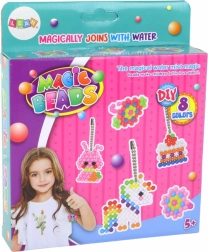 Vodné koráliky sú farebné guľôčky, ktoré sa po postreku vodou spoja do jedného celku – bez lepidla a žehličky. Deti si môžu vytvárať nekonečné množstvo tvarov, postavičiek a dekorácií a následne ich premeniť na prívesky či ozdoby do izby.