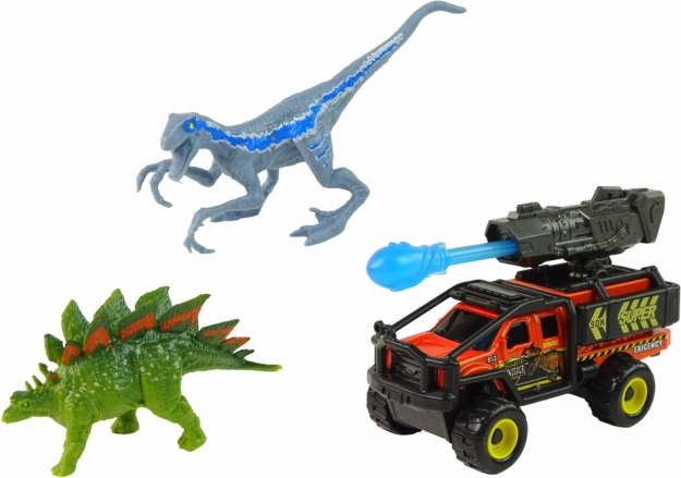 Táto sada zavedie deti do fascinujúceho sveta dinosaurov. Nájdú v nej velociraptora s modro–hnedým sfarbením a prúžkami pre autentický vzhľad a stegosaura v zelenej farbe s výraznou oranžovou „hrivou“ na chrbte. Súčasťou je tiež moderné terénne vozidlo vybavené raketometom s pohyblivým projektilom pre ešte väčšiu porciu akcie.