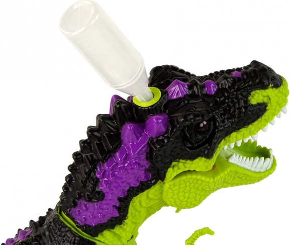 Na hlave dinosaura je otvor, do ktorého môžete naliať vodu pomocou priloženej fľaštičky. Pomocou tlačidla na diaľkovom ovládači (funguje na 2 batérie AA – nie sú súčasťou balenia) môžete vypúšťať paru cez jeho tvár a vytvárať tak žeravý oheň. V balení nájdeš aj diaľkové ovládanie v podobe dinosauřieho kvádra, ktorým môžeš ovládať jeho pohyb vpred.