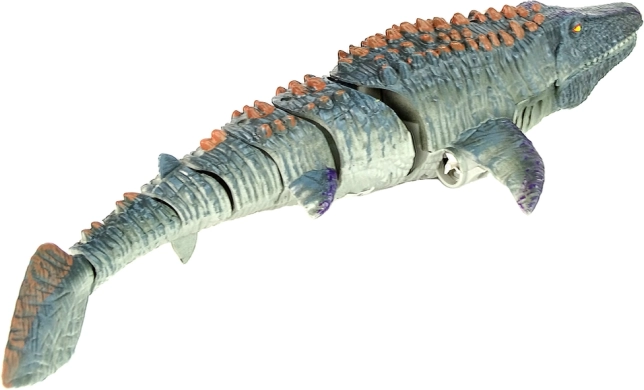 Dinosaurus má pohyblivý chvost, vďaka ktorému môže voľne plávať pod vodou. Pomocou hnedého diaľkového ovládania (13 cm x 7 cm x 4 cm), ktoré funguje na 2 batérie AA 1,5 V (nie sú súčasťou balenia), môžete ovládať jeho pohyby: hore, dole, doprava, doľava, dozadu, dopredu. Diaľkové ovládanie má navyše 2 tlačidlá na aktiváciu vodného rozprašovača, ktorý je umiestnený na zadnej strane tejto vodnej jašterice.