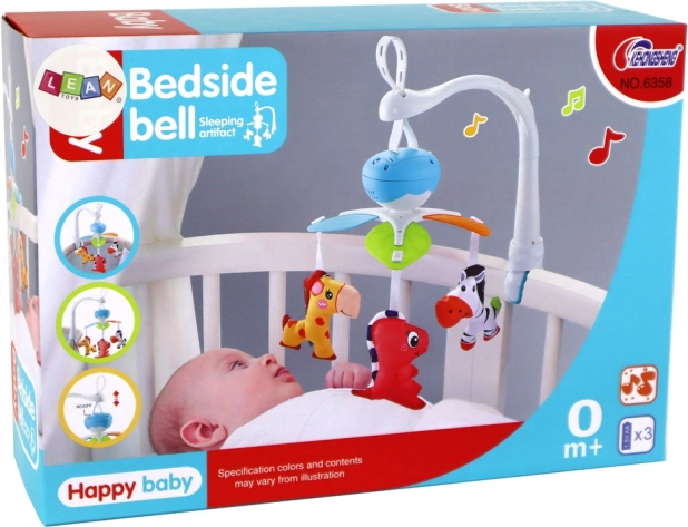 Kolotoč nad postieľku napomáha rozvoju motoriky a zmyslovému vnímaniu dieťaťa a privádza ho do fascinujúceho sveta zvukov a pohybu. Batérie nie sú súčasťou balenia. Potrebné sú 3 ks AA batérií 1.5V. Rozmery balenia: 31 cm x 22 cm x 10 cm. Výška držiaku: 30 cm.