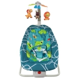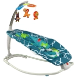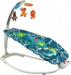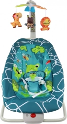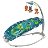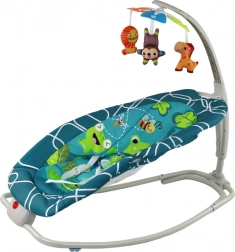 Tento produkt obsahuje bezpečnostné biele pásy na zaistenie bezpečia vášho dieťaťa. Prevádzka na dve 1,5 V batérie (nie sú súčasťou balenia) a ponúkajú rôzne možnosti zábavy, vrátane piesní a vibrácií, ktoré pomáhajú dieťaťu relaxovať a zaspať. Farebné kombinácie zelenej a modrej vytvárajú priateľské prostredie. Lehátko možno tiež premeniť na stabilné sedadlo rozložením bielych nožičiek.