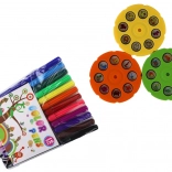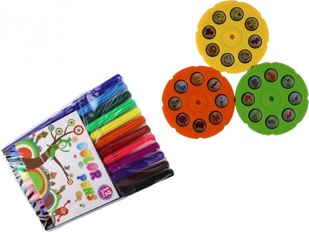 Súčasťou balenia sú 3 premietacie kotúče s rôznymi obrázkami, 12 farebných fixiek, zošit a praktická podložka–organizér, ktorá udrží všetky diely pokope. Hračka podporuje jemnú motoriku, trénuje predstavivosť a učí deti spoznávať zvieratá formou hry.