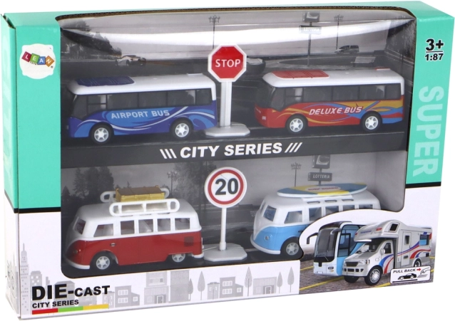 V balení nájdete 2 karavany (červený a modrý) a 2 autobusy (modrý „Airport Bus“ a červený „Deluxe Bus“) doplnené o dopravné značky. Odolné spracovanie a realistické detaily (okná, sedadlá, strešný nosič či surf) robia zo sady perfektný darček pre malých milovníkov vozidiel.