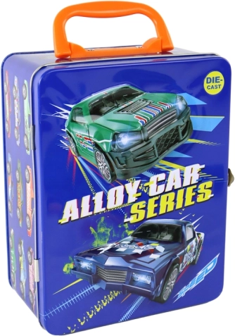 Súčasťou je štýlový plechový kufrík s motívom športových áut, kovovým zatváraním a sklápacím uchom. Vo vnútri nájdete prehľadné boxy na bezpečné uloženie autíčok – perfektné pre malých zberateľov na cesty aj do detskej izby.