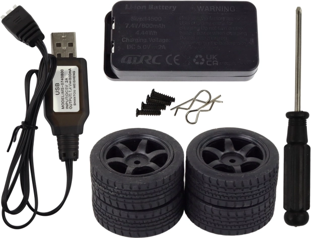 Pohodlné riadenie s volantom a spúšťou plynu, stabilný prenos bez rušenia a praktické doplnky: USB nabíjačka, Li‑ion batéria, náhradné pneumatiky a náradie.