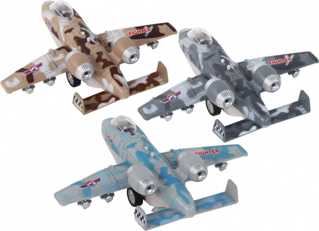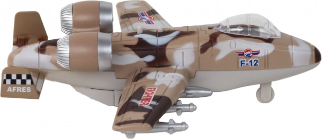 Vojenské stíhacie lietadlo Camo je úžasnou hračkou, ktorá zaujme každého malého prieskumníka. Vďaka svetelným a zvukovým efektom dodáva hre na autentickosti a podporuje rozvoj motorických schopností. Napríklad pri rýchlom pohybe umožňuje deťom simulovať rôzne scenáre a akcie spojené s vojenskými lietadlami. K dispozícii je v troch farebných variantoch: modro-sivej, sivej a béžovo-hnedej. Hračka je určená pre deti od 3 rokov a spĺňa certifikát CE a normu EN71.