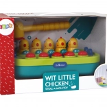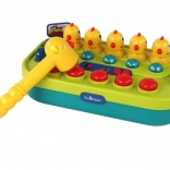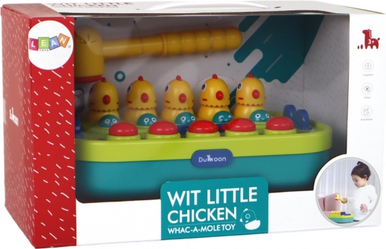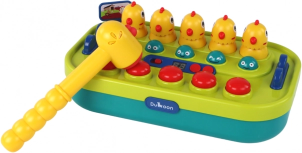 Rozbehnite domácu kladivkovú zábavu! Po zapnutí zaznie veselá melódia a červené tlačidlá sa náhodne rozsviecujú. Vašou úlohou je triafať podsvietené pozície priloženým kladivkom – aktivujete tým pohyb kuriatok a zbierate body. S rastúcim skóre sa hra postupne zrýchľuje, takže o napätie a smiech nebude núdza.