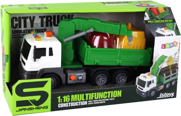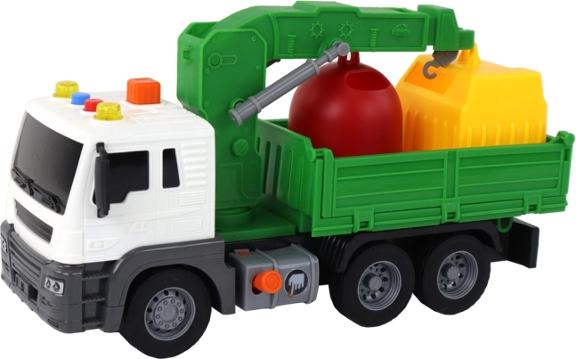 Interaktívny žeriav na streche sa zdvíha stlačením oranžového tlačidla a deti tak môžu nakladať a vykladať kontajnery. Súčasťou sú 2 farebné koše a 4 kartičky s typmi odpadu, ktoré hravou formou učia princípy recyklácie a ekológie. Kompaktné rozmery sú ideálne na hru doma aj vonku.