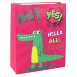 Dekor krokodíla s jemným trblietkom pôsobí priateľsky a zaujme na prvý pohľad. Pletené ružové uši sú príjemné do ruky a dobre držia tvar. Taška je vyrobená z kvalitného papiera/kartónu a predstavuje ekologickejšiu alternatívu k plastovým obalom.