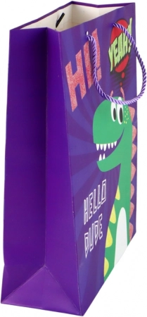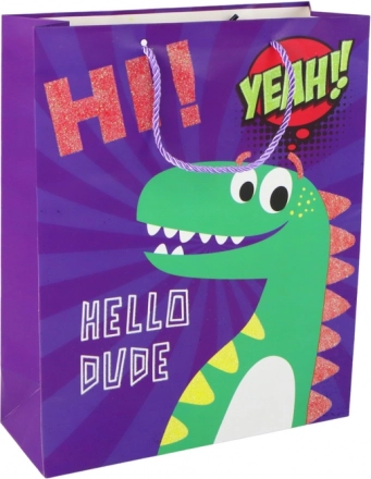 Rozveseľte každý darček štýlovým darčekovým vreckom v sýtej fialovej farbe s roztomilým motívom dinosaura. Vrecko z kvalitného papiera, so splietanými šnúrkovými ušami a trblietavými detailmi, je ideálne na narodeniny, sviatky aj ďalšie slávnostné chvíle. Rozmery 32 × 26 × 10 cm pohodlne pojmú stredne veľké darčeky.
