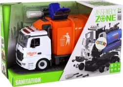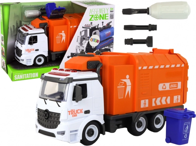 Objavte zábavnú stavebnicu smetiarskeho auta v oranžovo-bielej farbe so svetelnými a zvukovými efektmi. Vďaka priloženému skrutkovaču deti auto rozložia a znova zložia, čím rozvíjajú jemnú motoriku a technické zručnosti. Súčasťou je aj modrý kôš na odpad, ktorý možno zdvíhať a vysypávať – ideálny na hranie sa na triedenie a recykláciu. Auto má setrvačný pohon, svetelné a zvukové efekty a praktickú DIY montáž pre malých konštruktérov.