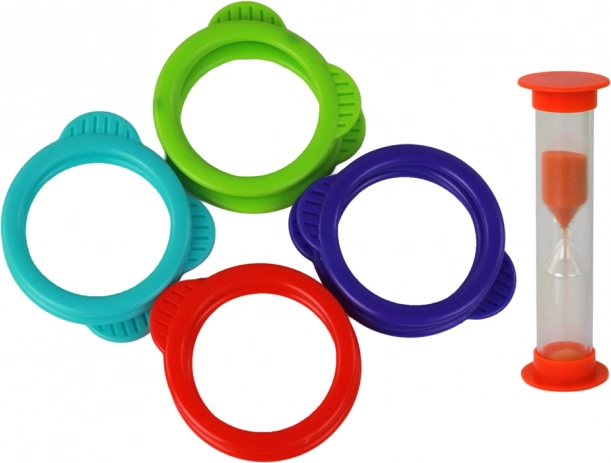 Súprava obsahuje krúžky v štyroch farbách a presýpacie hodiny na rýchle súťažné kolo. Nastavte čas a skúste nasadiť čo najviac krúžkov skôr, než sa piesok dosype.