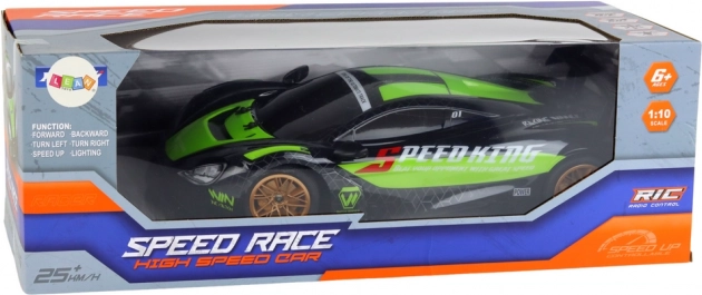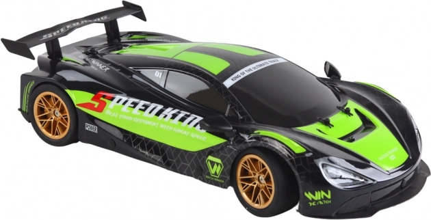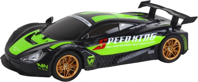 Užite si adrenalín s týmto RC športovým autom v mierke 1:10 v zeleno‑čiernom dizajne so zlatými diskami. Ponúka rýchlosť až cca 25 km/h, plynulé riadenie na 2,4 GHz, svetelné efekty a napájanie z 7,4 V akumulátora. Ideálne na zábavu vonku aj doma pre deti od 6 rokov.