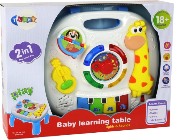 Stolík je vybavený svetlami a zvukmi, ktoré motivujú k objavovaniu a predlžujú dobu sústredenej hry. Vďaka zadným úchytom možno dosku ľahko pripevniť na detskú postieľku, takže sa vaša ratolesť môže učiť a hrať sa aj po prebudení.