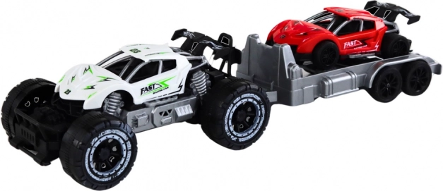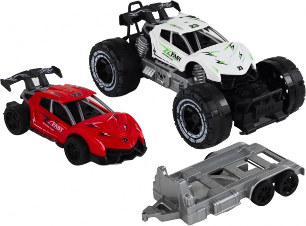 Táto sada hračiek obsahuje terénne auto v bielej farbe a červené športové auto umiestnené na prívese, čo podporuje rozvoj kreativity a predstavivosti pri hre. Deti si môžu vymyslieť svoje vlastné príbehy plné pretekov a dobrodružstiev na divokom teréne. Príves je možné jednoducho odpojiť, čo prináša nové možnosti kombinácií a herných scenárov.