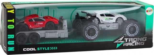 Terénne auto a červené športové auto na prívese predstavuje skvelú sadu hračiek pre deti, ktoré milujú automobilové dobrodružstvá. S robustnými kolesami a pevnou konštrukciou je pripravené na akékoľvek terénne výzvy.