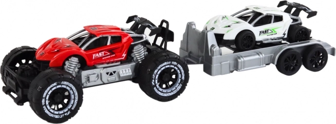 .Červené terénne auto s prívesom je sada, ktorá vaše dieťa zavedie do sveta vzrušujúcich dobrodružstiev a neobyčajných možností. Terénne auto s intenzívnou červenou farbou a pôsobivými masívnymi kolesami vyzerá ako skutočné off-road vozidlo, ktoré je pripravené zdolávať náročné terény. Ale to nie je všetko!