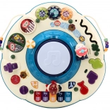 Závesná tabuľka so štyrmi figúrkami v štyroch rôznych farbách rozvíja manuálne a logické zručnosti dieťaťa, stimuluje kreativitu a sústredenie. V samotnom hornom rohu stolíka je bubienok, okolo ktorého sa zvieratká otáčajú, čo dodáva prvok pohybu a zaujímavosti.