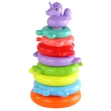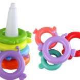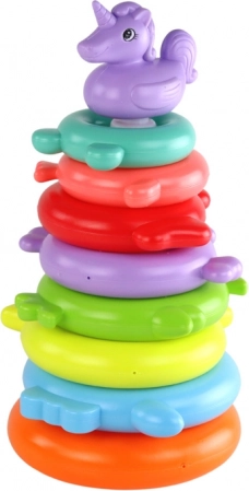 Deti skladajú krúžky od najväčšieho po najmenší, čím prirodzene rozvíjajú logické myslenie, rozpoznávanie farieb a triedenie. Jednorožec na vrchole dodáva hre čarovný nádych.