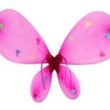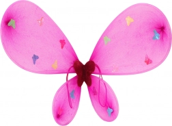 Veľké ružové krídla s farebnými motívmi motýľov a svietiacim obvodom. Ľahká konštrukcia a uchytenie na gumičky pre pohodlné nosenie.