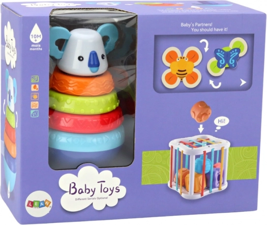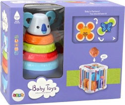 Táto sada obsahuje tri rôznorodé diely, z ktorých každý ponúka dieťaťu jedinečné zážitky a výzvy. Vežový triedič s kolieskami koaly pomáha dieťaťu nielen rozvíjať jemnú motoriku tým, že ukladá kolieska na správne miesta, ale tiež prináša zábavu vďaka hojdavému pohybu koaly.