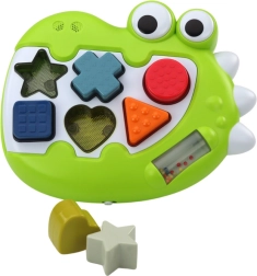 Tento interaktívny dinosaurus spája chytrú hru so zmyslovou stimuláciou. Po zapnutí sa otvory pre tvary rozsvietia a pri správnom vložení dielika zaznie radostná melódia, ktorá dieťa motivuje k ďalším pokusom. Deti sa prirodzene učia rozpoznávať tvary a farby, precvičujú koordináciu oko–ruka a objavujú zvukové aj hmatové podnety.