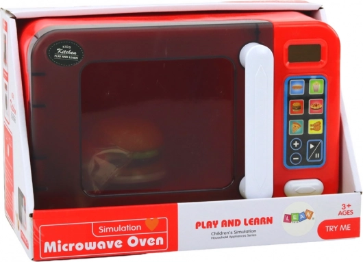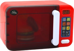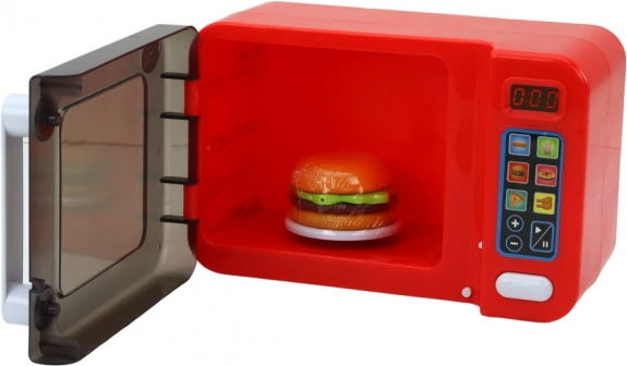 Interaktívna detská mikrovlnná rúra v červenej farbe premení kuchynskú hru na realistický zážitok. Ponúka svetelné efekty, otáčajúci sa tanier, otváracie dvierka a programy ohrevu. Súčasťou sú doplnky – hamburger, hranolky a hot dog. Bezpečná zábava pre deti od 3 rokov, napájaná 3× AA (súčasť balenia).
