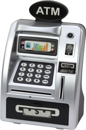 Detský bankomat je viac než len hračka. Používa čítačku odtlačkov prstov a detskú kreditnú kartu pre autentický zážitok. Vloženie karty, zadanie kódu a použitie odtlačku prsta odomknú veselú melódiu a fanfáry pri otvorení zásuvky.