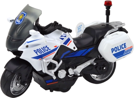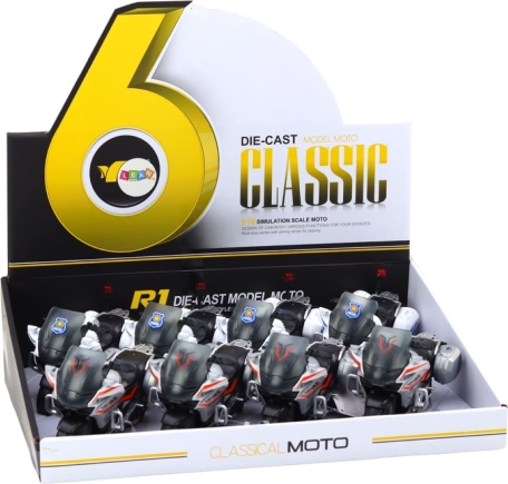 Dostupná v dvoch variantoch - policajné a športové. Pred nákupom si prosím vyberte model. Jednotlivé hračky sú balené samostatne, ale v balení je 8 kusov. Parametre motorky sú 17cm x 10,5cm x 8cm. Hračka je certifikovaná CE a spĺňa normy EN71. Vhodná pre deti od 3 rokov.