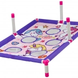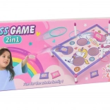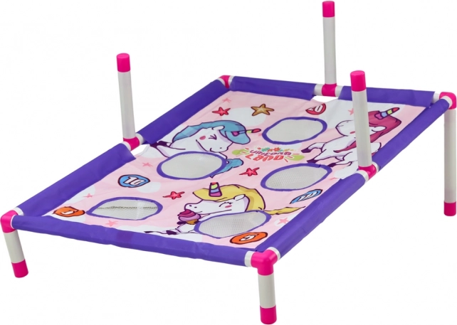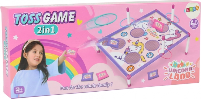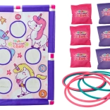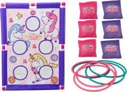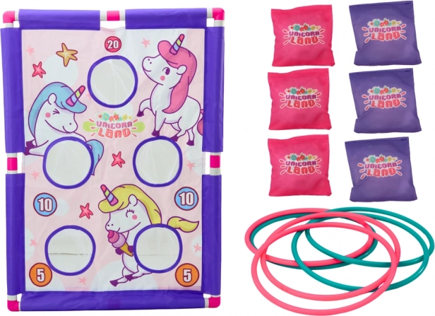Hru tvorí pevná, farebná herná doska zdobená obrázkami roztomilých jednorožcov, ktorá nielen podporuje hru, ale aj inšpiruje detskú predstavivosť. Herná doska obsahuje bodovací systém, ktorý do hry prináša prvok súťaživosti a vzrušenia. Súčasťou sady sú špeciálne navrhnuté hádzacie vrecúška pre stabilitu letu a presnosť zásahu a farebné obruče.