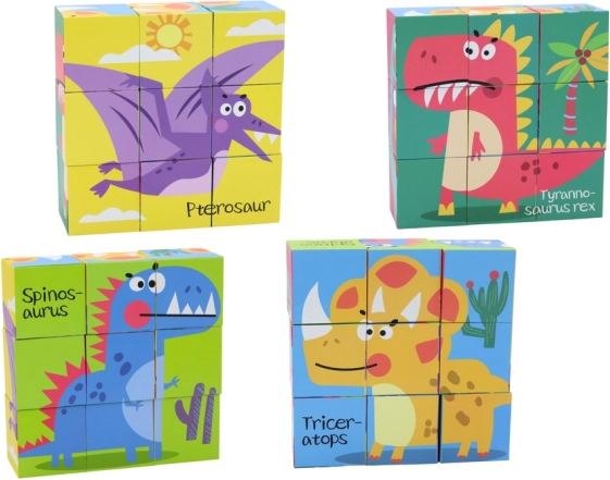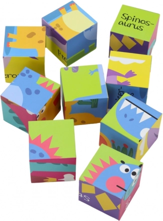 Každá strana kociek tvorí iný obrázok – deti si poskladajú T-Rexa, Pterosaura, Spina, Triceratopsa, Stega aj Diploduka a naučia sa ich názvy.