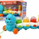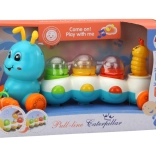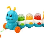 Farebná ťahacia húsenica na kolieskach so šnúrkou umožňuje dieťaťu začať hru tým, že ju ťahá, zatiaľ čo počúva veselé melódie. Stimuluje sluchové vnímanie a rozvíja motorické zručnosti pri ťahaní a vedení húsenice.