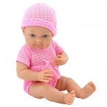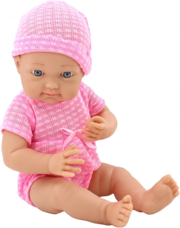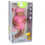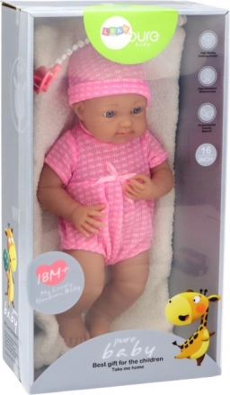 Textilný ružový komplet s čiapočkou, realistické črty a modré oči dodávajú bábike pôvab. Praktický cumlík na šnúrke sa nestratí a umocní herné scenáre starostlivosti.